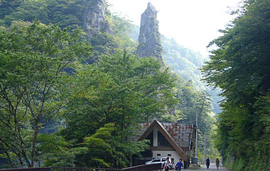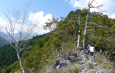 鍾乳洞先の登山口に出る:前に聳える岩は梵天岩