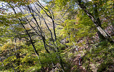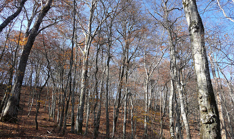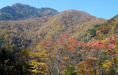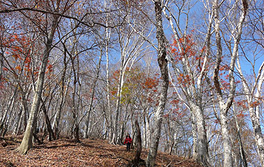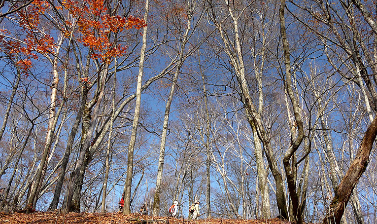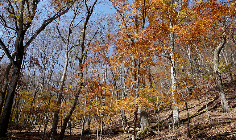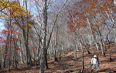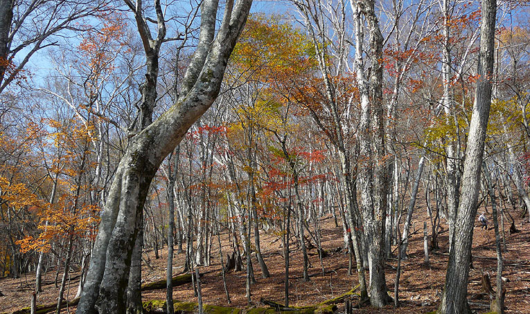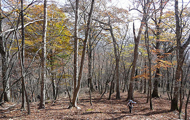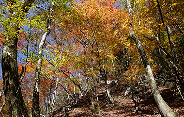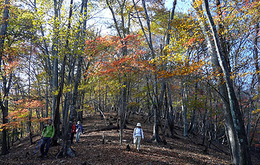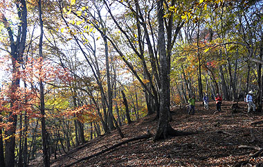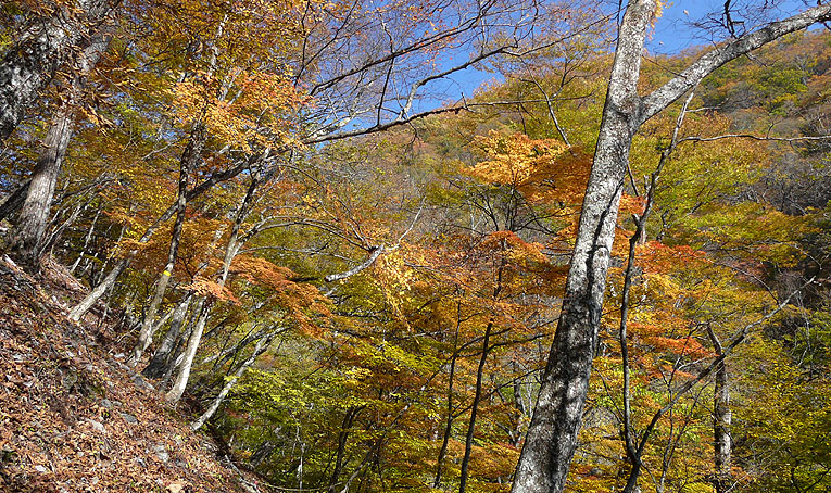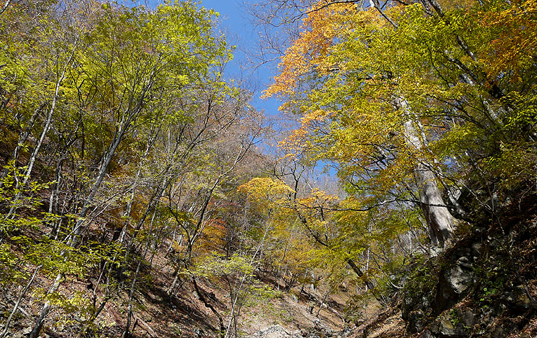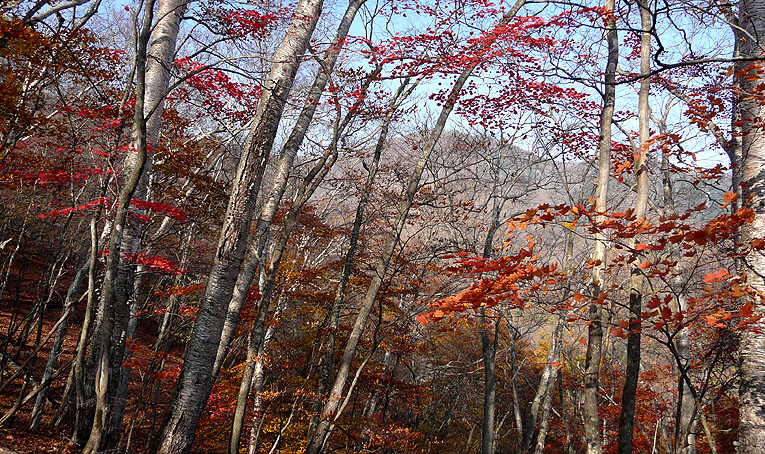 | コース&タイム:小川谷林道終点(9:10)→三又→[酉谷]→酉谷山(12:30)→[長沢背稜]→滝入ノ峰分岐→[尾根通し]→三又→小川谷林道終点(14:40) [天候/晴れ] [メンバー/8名] [歩数/約27,100歩] [歩行時間/9:10-14:40] ※2009秋のオフ会 [概要] :小川谷林道終点から入り一旦三又まで下り酉谷を登る。上部緩斜面から枝尾根を登り酉谷山直下の長沢背稜に出る。酉谷山を経由し滝入ノ峰から尾根通しに三又に下る。酉谷下部の谷筋ではまだ緑の葉も多いが登るに連れ色づきは増し中腹は紅葉の盛り。上部から長沢背稜周辺はほぼ落葉。 |