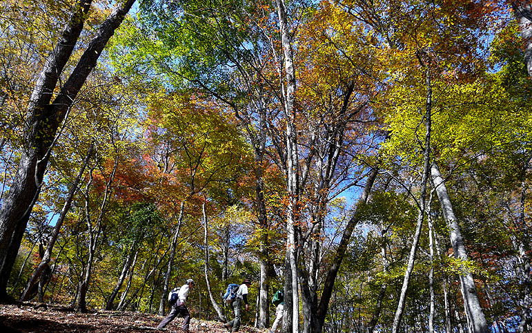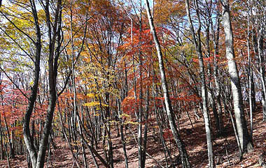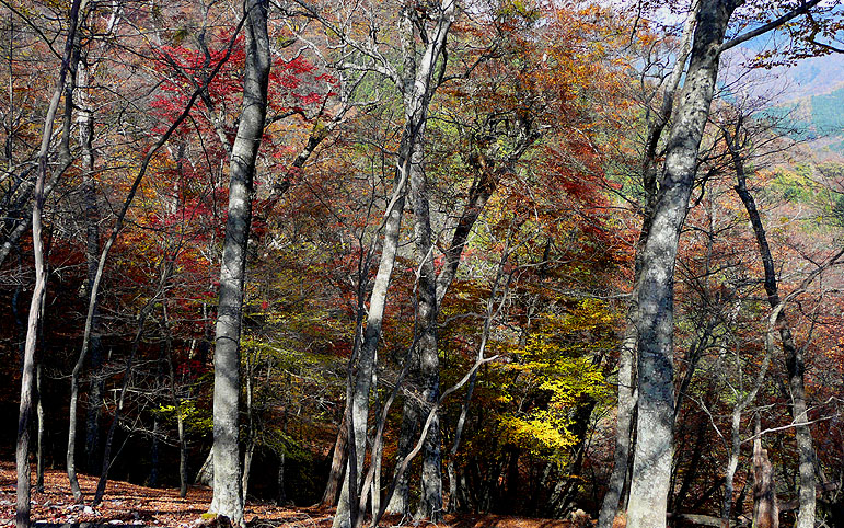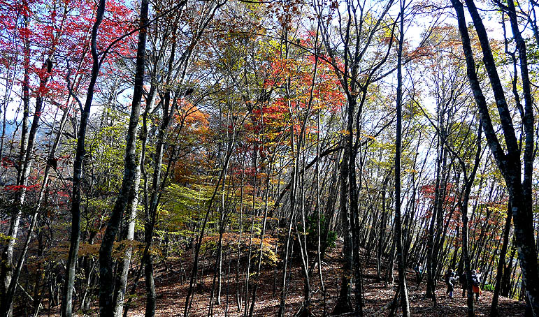 巨樹脇の尾根通しから見る斜面の紅葉 |