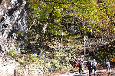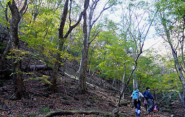 谷筋の緩斜面に出る:谷底周辺は緑の葉が多い |