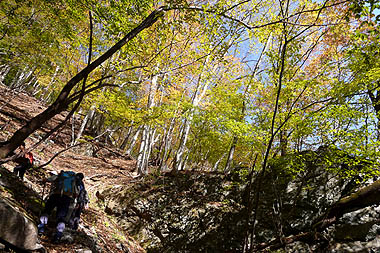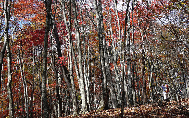 人形山への尾根通し:まだまだ赤が目に付く |