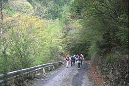 大丹波林道を行く。 周辺の木々は芽吹きが始まり、柔らかい緑となっていた。 この時は林道工事中であり、登山道に入る道が分かりにくかった。 |