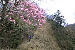 踊平で長沢背稜の縦走路に合流、この周辺はアカヤシオが多く、丁度花の見頃を迎えていた。 まだ、他の木がほとんど芽吹いていないため、淡いピンクの花は周囲でもひときわ目を引いた。 |