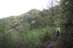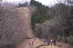 川乗山のひとつ手前・曲ヶ谷北峰へは、少しの間だがきつい登りを強いられる。 ここはかなりつらい登りだ。 |