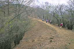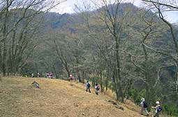 踊平から横ヶ谷の源頭部にかけては、登り勾配ぎみながら緩やかな稜線上の道で、防火帯も広く、この時期は周囲も明るく歩いていて気持ちがよい。 |