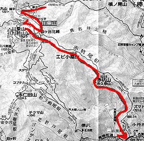 | (コース・タイム) 大丹波林道 8:35→ 10:05 獅子口小屋跡 10:15→ 10:45 踊平 10:55→ [長沢背稜]→ 11:50 川乗山(昼食) 12:40→ 13:50 赤久奈山 13:55→ 15:10 JR古里駅 [天候 ;薄日〜曇り〜雨] [歩数 ; 約23,600歩] |