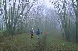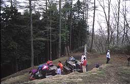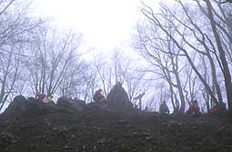 蕎麦粒山頂。 この時は雨とガスで視界は全くなかった。晴れていれば東面の展望が利き、東京湾も見渡すことができる。 ここで昼食と考えていたが、狭い山頂なので、パーティでの先客があると弁当を広げるのもままならない。 |
