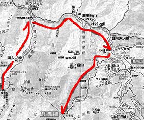 | (コース・タイム) 東日原 8:10→{ヨコスズ尾根]→ 9:50 滝入ノ峰 10:00→ 10:45 一杯水避難小屋 11:00→ 12:05 蕎麦粒山→12:15(昼食) 12:50→ 13:30 日向沢ノ峰→ 13:55 踊平 14:10→ 15:25 百尋ノ滝→ 16:05 細倉橋 [天候 ; 曇り〜雨] [歩数 ; 約28,000歩] |