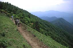 防火帯の縦走路から見る奥多摩の山々も5月末に来たときよりは、だいぶ緑が色を増していた。 これから夏場にかけては、緑は日々色を増し、下草の育ちも早く、周囲の変化も激しくなる。 |