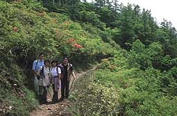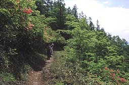 千本ツツジ付近は、名のとおりツツジが多く、縦走路脇にも沢山のツツジが自生し、ヤマツツジが見頃も間近となっていた。しかし、年々花の咲き具合が少なくなっているようで、気になった。 |