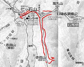 | (コース・タイム) 峰林道終点 9:00→ 9:05 赤指山(1,332m)→ [赤指尾根]→ 10:25 千本ツツジ 10:45→ 11:15 七ツ石山(昼食) 11:55→ 千本ツツジ 13:25→ 14:30 峰林道終点 [天候 ;晴〜曇り] |