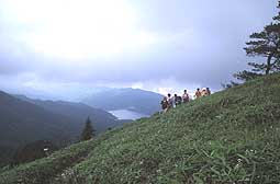 登山口から樹林の登りが続くが、峠が近くなると緩やかになり、展望が開けてくる。 後方にはダムが見えている。 峠付近は花が多く、道脇でも20数種の花が見られた。 |