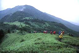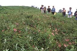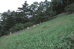 狼平は、広い草原になっており、ミヤコザサが下層を覆っているため、あまり花の種類は多くないが、気持ちの良い平坦路で、歩いていても気持ちがよい。 |