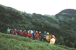 石丸峠まで戻ると、雨は小降りになり、ようやく一息つけ、記念写真を撮る余裕もできた。 (最も、これまでは降りがひどく、カメラを出せるような状態ではなかったが。) |
