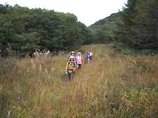 草原に出るとススキが色づき秋も本番を思わせた。 ここまで来れば林道合流に近く、平坦で気持ち良くあるくことができた。 |