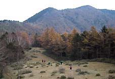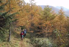 黒エンジュ尾根に入り、しばらく登るとカラマツ林となる。紅葉は丁度盛期で見事な色合いを見せていた。 この尾根は緩やかな登りがつづき、道も柔らかく非常に快適な山登りが楽しめた。 |