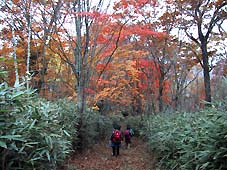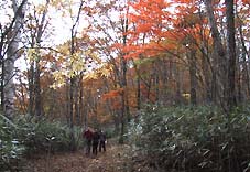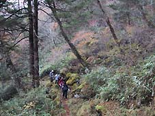 帰路は、一旦、小屋から牛王院平まで引き返し七ツ石尾根を下った。 この尾根も紅葉は素晴らしく、尾根の中程付近は、まさにモミジのトンネルであった。 |