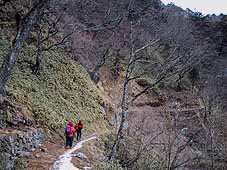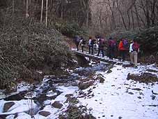 | 作場平橋から歩き始め、すぐに小さな沢を渡る。 日陰には、昨年暮れに降った雪がまだ2〜3cm残っていたが、この辺は平坦なため、アイゼンが必要なほどではなかった。この先、少し登るとヤブ沢と一休坂の分岐がある。 |