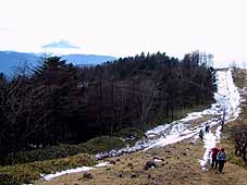 | 笠取小屋を過ぎると間もなく、草原に出る。 草原の日向には雪がなかったが、少し日陰にはまだ雪が残っていた。 草原に出ると展望は効き、歩いていても気持ちの良い場所だ。雪を被った富士山や南アルプスを一望することができる。 (後方左奥、かすかに見えるのは富士山) |