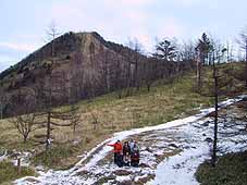 | 多摩川、富士川、荒川の分水嶺(小さな石碑がある)から見る笠取山。 さすがに、冬場は景色が寒々しい。 |