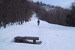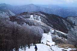 小屋をあとに、鷹の巣山頂までの登りは広い防火帯になっており、陽当たがよく、比較的雪も少なく、トレイルもしっかりしており、まあまあの天気にも恵まれ、ややきつい登りではあるが、気持ちのよい冬山が堪能できた。 |