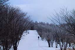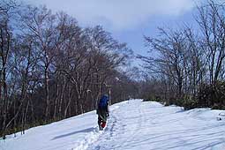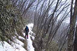 | 浅間尾根の上部は、落葉樹の広い尾根道で傾斜も比較的緩やかな箇所が多く、歩きやすい尾根だ。 この日は、冬型の気圧配置が強く、下る途中、一時吹雪模様となった。 (雪はだいぶ溶けたが、一部でまだ70cm程度残っている場所や、アイスバーンとなっている場所もあり、コースによっては注意が必要だろう。) |