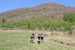 | 車を大平牧場のP(1台500円)に置き、牧場の中の少し歩き登山道へと入った。ここまで車で入ると通常の徳和登山口より90分程度短縮でき、随分行程が楽になる。 牧場周辺のカラマツは新緑の盛りで、淡い緑が非常にきれいだった。短い距離だがこの牧場からの草原からは富士山も大きく見え、素晴らしい場所だ。 |