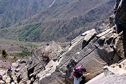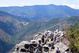 | 乾徳山頂は大きな岩の塊でできていて、周囲に草木がなく、遮るもののない360度のパノラマが楽しめる。 ただ、うっかり景色に見とれてバランスを崩したりすると、とんでもない災難が待ち受けていることも忘れてはいけない。 |