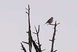 | 防火帯に出るとビンズイが高い梢で盛んに囀っている。草原に巣を作り、ヒナを孵すため、「巣があるから近づくな」と警告しているのかもしれない。山は人間だけのものではない。この時期の防火帯歩きは、道以外は踏み込まないよう充分注意しなければならない。 |