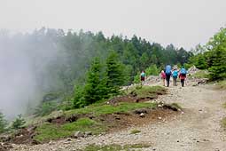 | 雲取山頂付近はガスが流れていた。雲取山は素晴らしい展望が得られるが、この時期の登山で展望を期待するのは難しい、が、この時期にしか咲かないキバナノコマノツメや、北面のオサバグサなど、展望を補って余りある収穫も多い。 |