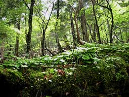 | 雲取北面は亜高山性針葉樹の林になっており、木々が世代交代を繰り返す様が見られる貴重な場所だ。 時を経た倒木には一面に苔が付き、その上にマイヅルソウが花を咲かせていた。こういう風景に出会えるのもここだけの楽しみだ。 |