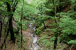 | 大ダワから大雲取谷を下った。この道は東京都の最西端に位置する。時折谷を見降ろせる場所があるが、唐松谷同様原始の森で、深く幽幻な流れは見る者を引きつける。 (大雲取谷源頭部にて) |