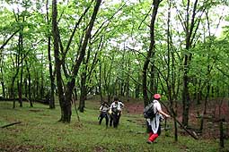 | 登山道はカラマツ林からスギ林へと変化する中を登っていく。ひとしきりのきつい登りを過ぎ、尾根に出た後は道を少しはずれ落葉樹の中を登った。やや遅かったがヤマツツジの花もチラホラ見られた。 | ||