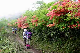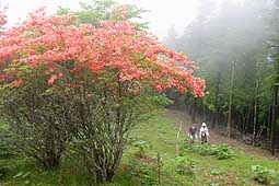 | 千本ツツジの稜線から一旦石尾根縦走路に合流し、再び縦走路をはずれ、日陰名栗峰に向かった。 この山頂手前はややきつい登りが続くが、カラマツの林が切れると展望は開け、お天気が良ければ南アや富士山等が望めるのだが、この日は霧がかかり展望はなかったが、たとえお天気でも目が行くのは足元だったかもしれない。 この付近もヤマツツジは見事だ。 |