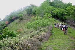 | 防火帯の先端で稜線に登り千本に引き返した。付近は広い防火帯になっており、時期はやや遅いながらもワラビのまだ沢山出ていた。こうなると「花より団子」か、目は地面の方に向かい、きれいなツツジも目に入らなくなるらしい。 |