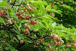 | 日陰名栗峰から鷹の巣の避難小屋まで下った後、帰路は石尾根の縦走路を千本ツツジまで引き返した。 縦走路上の開けた箇所にはヤマツツジと並び、サラサドウダンツツジが点々と自生し花の時期を迎えていた。ヤマツツジのような派手さはないものの、下向きに付ける小さな花は可憐さではこちらの方が上だ。 |