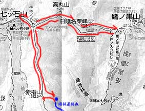 | (コース・タイム) 峰林道終点 9:00→[赤指尾根]→ 9:30 峰からの登山道に合流 9:40→ 10:35 千本ツツジ (山菜採休憩)11:10→ 11:50 日陰名栗峰(昼食) 12:40→ 12:55 鷹の巣避難小屋 13:15→ 14:05 千本ツツジ 14:20→ 15:35 峰林道終点 [天候 ; 霧〜曇り] [歩数 ; 約26,200歩] |