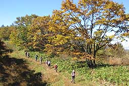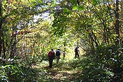 | 板橋峠(深泉峡)からしばらくは斉木林道を歩く。(今は車の通れるような道ではない)。15分程行くとハチワリ尾根の尾根通しの道と林道を分ける。 尾根通しにはミズナラのが多いが、だいぶ色がつき、華やかになっていた。 |