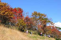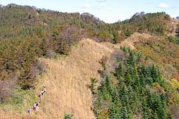 | ハチワリ尾根は防火帯はススキが多く、光線の具合により穂が真っ白に光り、木々の紅葉と素晴らしいコントラストを描いていた。 ススキをかき分けて進むが、背丈以上の箇所も多く、ススキの中を泳いで行くような雰囲気があった。 |