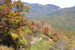 | 防火帯周辺の木々は紅葉したものも多く、青く澄んだ空にきれいに映えていた。 この後、防火帯は終わり、白沢峠手前は林の中を急に下っていく。 |