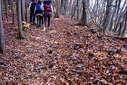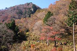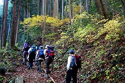 | 一ノ瀬集落にある将監峠への入口からしばらく将監小屋に通じる林道を歩く。歩き始めはスギの植林で薄暗い所もあるが少し進めば落葉樹とカラマツの林に変わる。丁度紅葉は見頃で陽を浴びた葉が様々な色彩で輝いていた。 林道をしばらく歩くと七ツ石尾根の分岐となる。七ツ石尾根も下部は落葉樹の林、登るうちカラマツの林となるが、紅葉の真っ盛りで素晴らしい尾根歩きが堪能できた。 (写真は七ツ石尾根下部・紅葉の中を登る) |