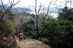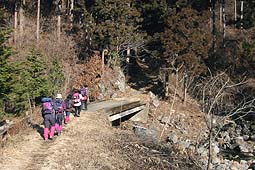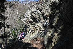 | 鍾乳洞から先もまだしばらくはきつい登りが続く。左の写真の岩場まで来ると登りも緩やかになる。 この周辺のみ落葉樹の林となり、冬枯れた木々の間から大岳山を展望できる。 この付近でヒガラとシジュウカラの声が聞かれたが、地鳴きから囀りに変わっていた。まだ鳴き声はぎこちないが春もそこまで、という感じがする。 |