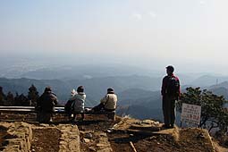| 日の出山頂は低い割には、奥多摩の山々の中では展望が良い方だ。特にここより東には高い山が無く、東京都心方向が良く開けている。今日は霞がかかり、新宿の高層ビル群や東京湾、房総半島などは見えなかったが、多摩の各都市はは確認できた。 北後方では筑波山付近まで確認できた。お天気さえ良ければ北面もかなり遠方まで見渡せる。 |