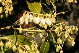 | 山頂直下を取り巻くようにアセビが植えられ、蕾もだいぶ膨らんでいた。南向きの日当たりのよい面では早くもアセビが花を付け始めた樹もあった。 あと半月もすれば、かなりの樹に花が咲きそうだ。奥多摩でも日の出山付近の春は早い。 |