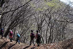 | 奥多摩周遊道路・月夜見第2駐車場は標高1,000m近く、最初は急な下りから尾根に入る。惣岳山までは痩せた尾根も多い。周辺の芽吹きにはやや尚早だが、道の両脇にはダンコウバイやアブラチャンなどは花期を迎えていた。 (登山者の頭上に咲いているのはアブラチャン) |