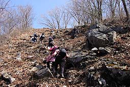 | 通称・ソーヤの丸デッコ手前の登りは、長くはないがかなりのきつい登りとなる。 この周辺は岩があちこちで頭を出し、植物も他ではあまり見かけない種類が自生する。 |