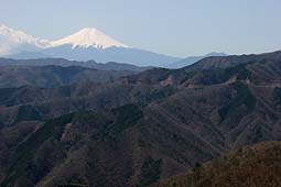 | ソーヤの丸デッコは、三頭山・御前山・大岳山のいわゆる奥多摩三山の中では最も展望が開ける。 この日はお天気も良く、山並みの彼方に雪を被った富士山がひときわ鮮やかだった。 |