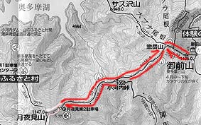 | (コース・タイム) 周遊道路・月夜見第2P 9:20→ 9:50 小河内峠 → 10:45 ソーヤの丸デッコ 10:55→ 11:25 御前山 11:35→ 11:50 惣岳山(昼食) 12:25→ 13:10 水窪山 13:25→ 13:50 月夜見第2P 9:20→ [天候 ;快晴] [歩数 ;約17,700歩] |
