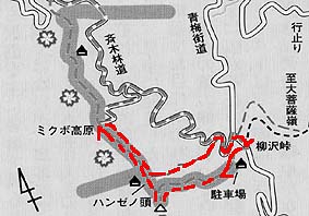| (コース・タイム) 柳沢峠P 9:00→ 9:50 柳沢ノ頭 9:55→ 10:10ハンゼノ頭 10:15→ 10:30 三窪高原(四阿・昼食) 11:05→ 11:35 柳沢-ハンゼノ頭間の鞍部 → 12:10 斉木林道合流→ 12:25 柳沢峠P [天候 ;曇・霧] [歩数 ;約10,800歩] |