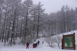 | 柳沢峠の駐車場に車を止め、ここから登山開始。 前日、この周辺は雪模様だったらしく、木々にも着雪し、一面が白い世界だった。 積雪は50-80cmくらいはありそうだが、トレイスははっきりしており、雪を踏み抜くような箇所はなさそうだ。 |